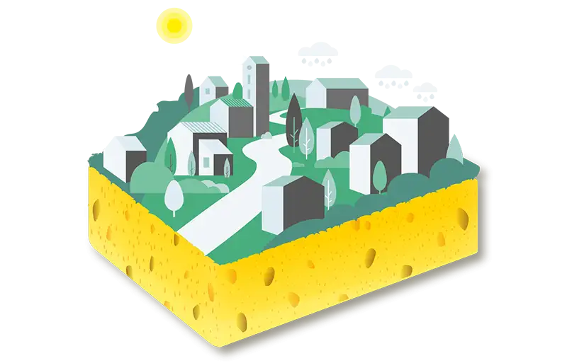 Das Prinzip der Schwammstadt ist erstmal relativ einfach erklärt: Regenwasser wird lokal im Boden aufgenommen und wie in einem Schwamm gespeichert, anstatt es in die Kanalisation abzuleiten. Ganz so einfach, wie es sich im ersten Moment anhört, ist es aber doch nicht. Hinter einer Schwammstadt steckt ein ganzes Konzept – viele Komponente spielen eine entscheidende Rolle und setzen eine professionelle Planung voraus; Beläge sind das eine, aber auch Bäume und Grünflächen, und die gesamte Bewässerung spielen eine wichtige Rolle.