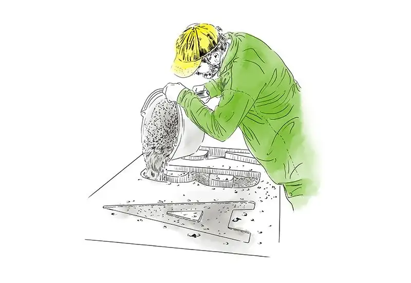 Ensuite, le béton liquide est fabriqué dans la centrale de mélange. Un mélange de sable et de gravier (82%), d’eau (6%) et de ciment (12%). Une fois la bonne consistance obtenue, il est coulé dans le coffrage. Des colorants peuvent être ajoutés selon les souhaits du client.